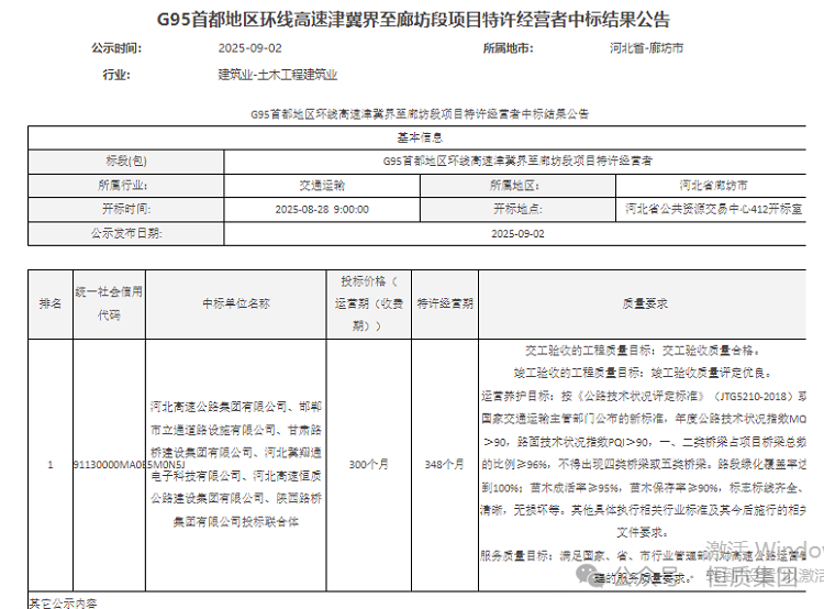 喜訊迎金秋,奮斗結(jié)碩果!8月28日,恒質(zhì)集團成功中標G95首都地區(qū)環(huán)線高速津冀界至廊坊段項目特許經(jīng)營者。G95首都地區(qū)環(huán)線高速津冀界至廊坊段項目估算總投資89.